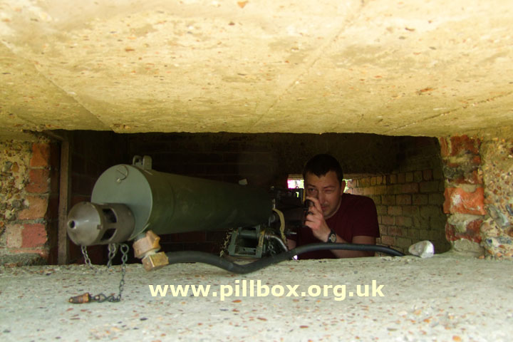 This position allows the gunner to be near the centre of the pillbox with sufficient space for the No.2 to be stationed to his right ready to reload.