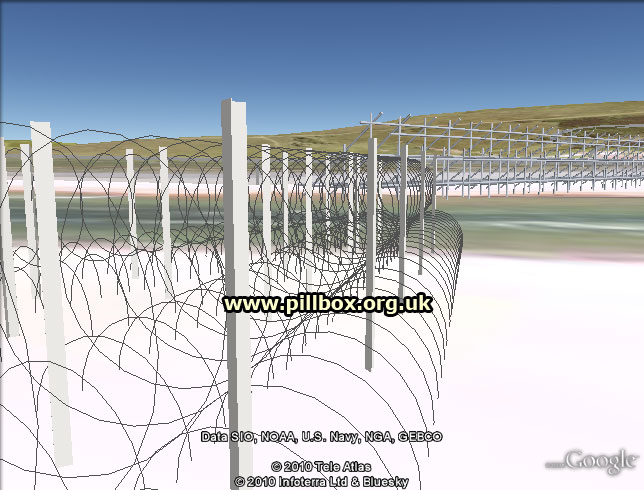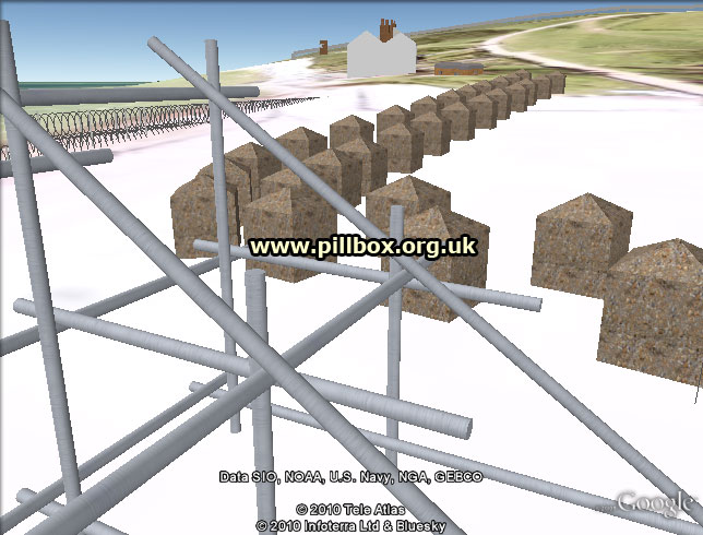 I already had the models of scaffolding and the Type 25, Type 24 and Type 23 pillboxes, so it was a simple matter of importing them into Google Earth. Rough models of other pillboxes (based on my own survey data) were duly added, along with a crude method of representing barbed wire and a minefield overlay. The model had moved on from solely depicting surviving concrete defences and was now reconstructing long-gone defence works based on original documents.